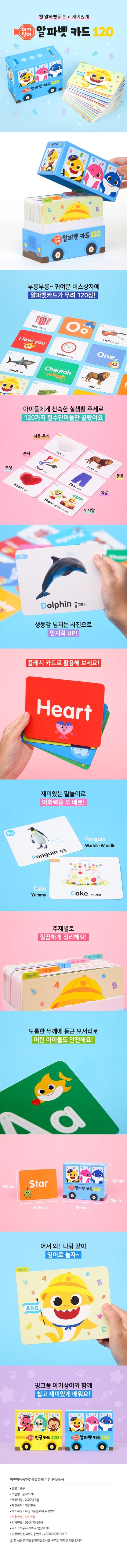 첫 알파벳을 더 재미있게, 더 친숙하게 접할 수 있도록 실생활 8가지 주제(사물, 음식, 동물, 숫자, 색깔, 모양, 캐릭터, 인사말)의 단어들로 구성되어 있어요. 120장의 국내 최다 카드로 다양한 영어 단어를 익힐 수 있어요. 앞면에는 귀여운 아기상어와 친구들이 큼직한 영어 단어와 함께 들어 있어요. 뒷면에는 깔끔한 바탕에 세련되고 생생한 사진으로 단어를 인지할 수 있어요. 생동감있는 실사 카드로 인지력도 키우고, 다양한 색감의 카드로 아이들의 흥미도 잡아요.